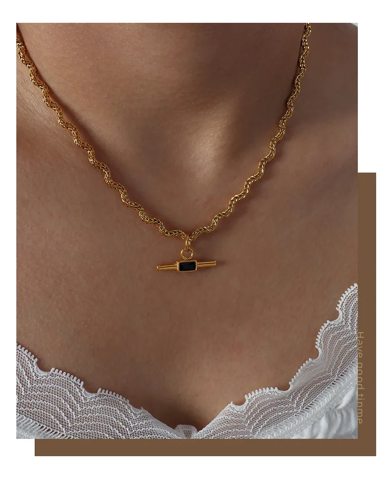 Ein Statement für sich: Diese Halskette mit gedrehter Struktur und markantem schwarzen Anhänger zieht alle Blicke auf sich. Die strukturierte Kette kombiniert mit dem T-Bar-Verschluss verleiht deinem Look eine kraftvolle Eleganz. Edelstahl, 18K vergoldet, langlebig und wasserfest.