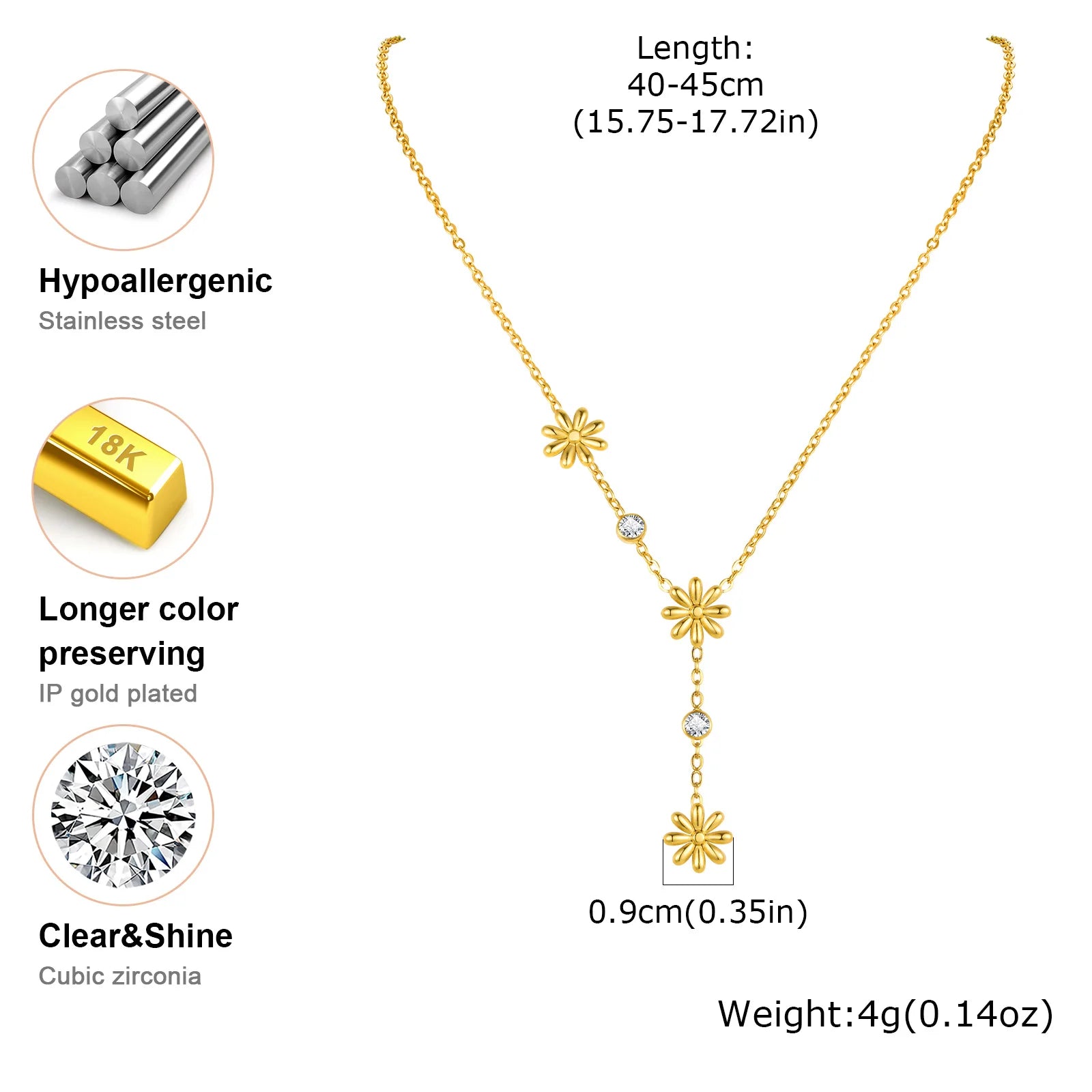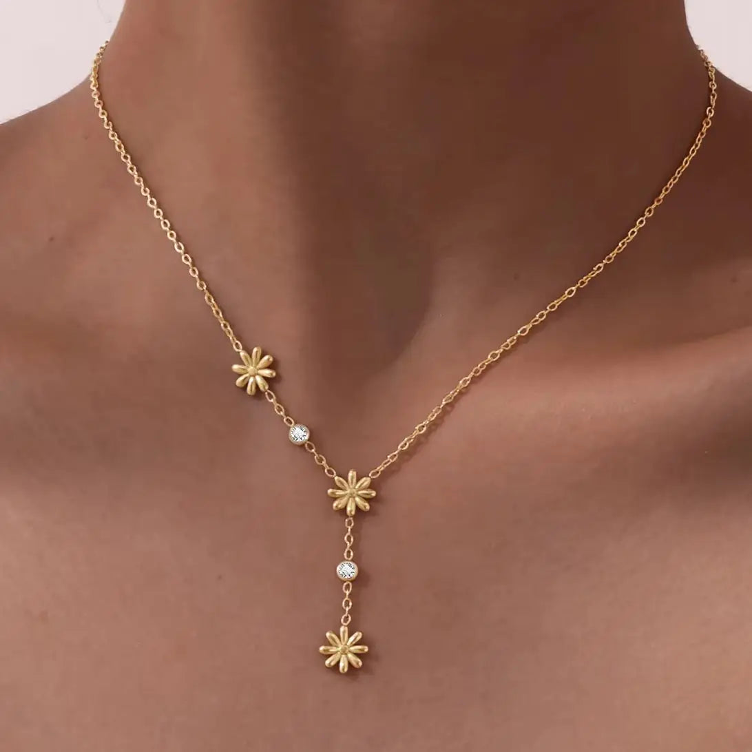 Drei kleine Gänseblümchen, filigran in Szene gesetzt, tanzen an dieser eleganten Y-Kette – perfekt für ein feminines, romantisches Statement. Zwischen den Blüten funkeln feine Zirkonia-Steine und verleihen der Kette einen Hauch von Leichtigkeit und Glanz.