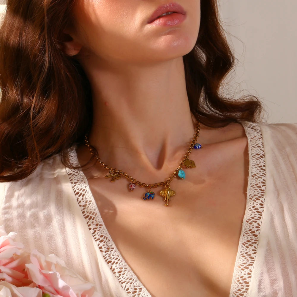 Diese liebevoll gestaltete Charm-Kette kombiniert niedliche Elefantenmotive mit farbenfrohen Perlenanhängern und bringt spielerische Leichtigkeit in deinen Alltag. Jeder Anhänger ist ein kleines Symbol für Glück, Abenteuer und Kreativität.