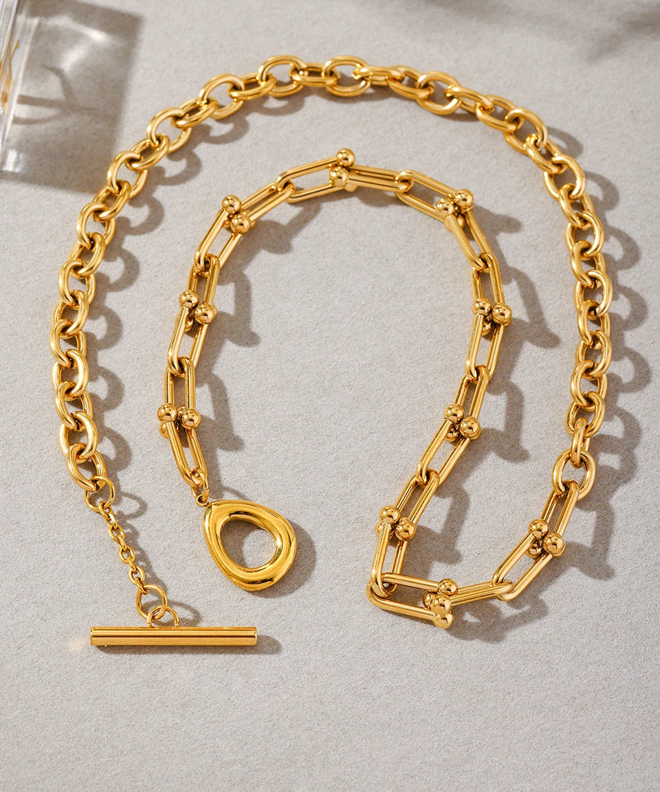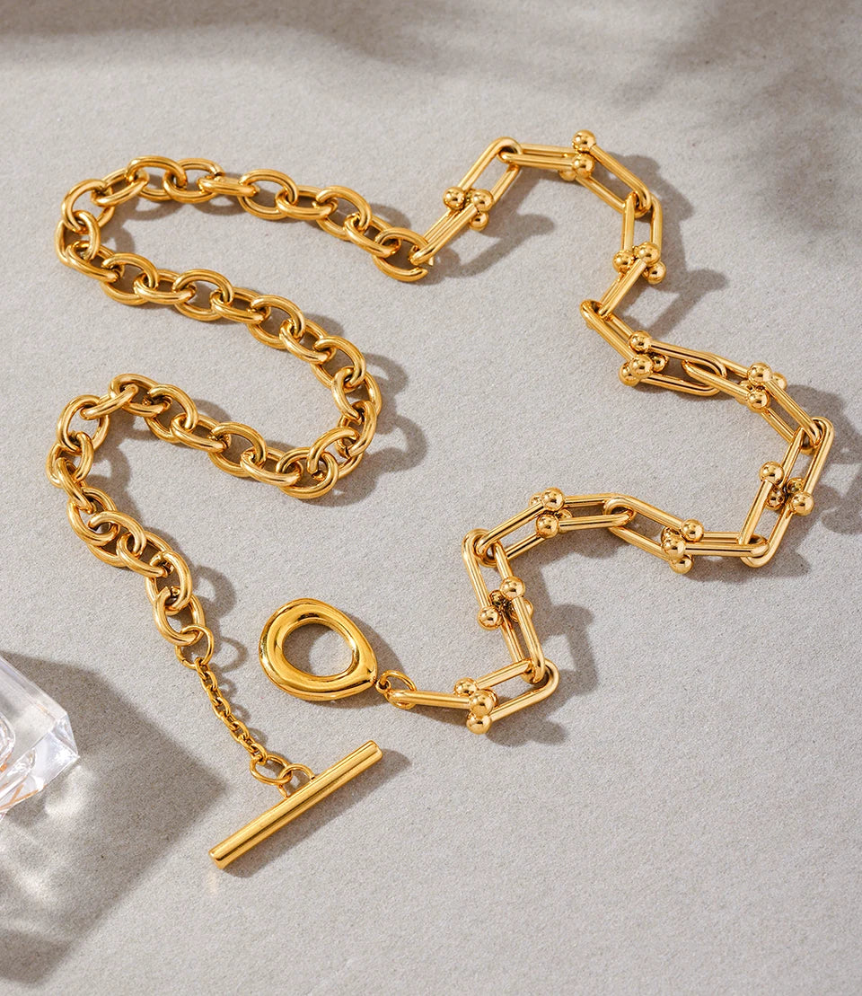 Ein echter Blickfang für alle, die das Besondere lieben: Diese Statementkette kombiniert zwei verschiedene Gliederdesigns – ein klassisches Rundglied auf der einen Seite und ein modernes, geometrisches Muster mit kleinen Kugelakzenten auf der anderen. Das asymmetrische Design mit dekorativem T-Verschluss macht dieses Schmuckstück einzigartig und absolut trendstark.