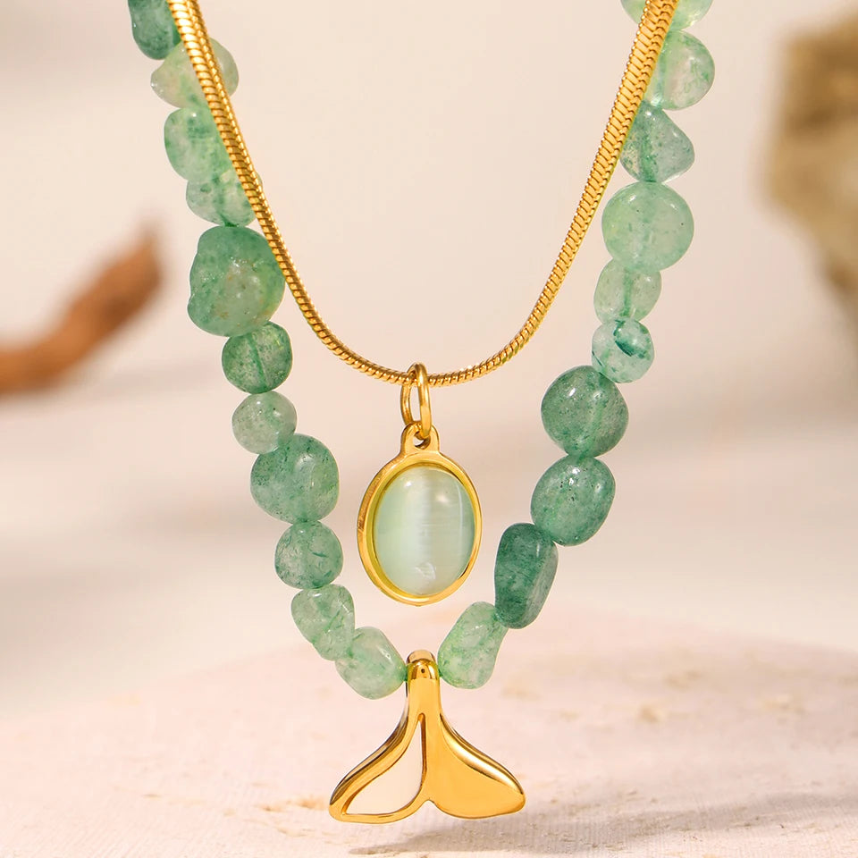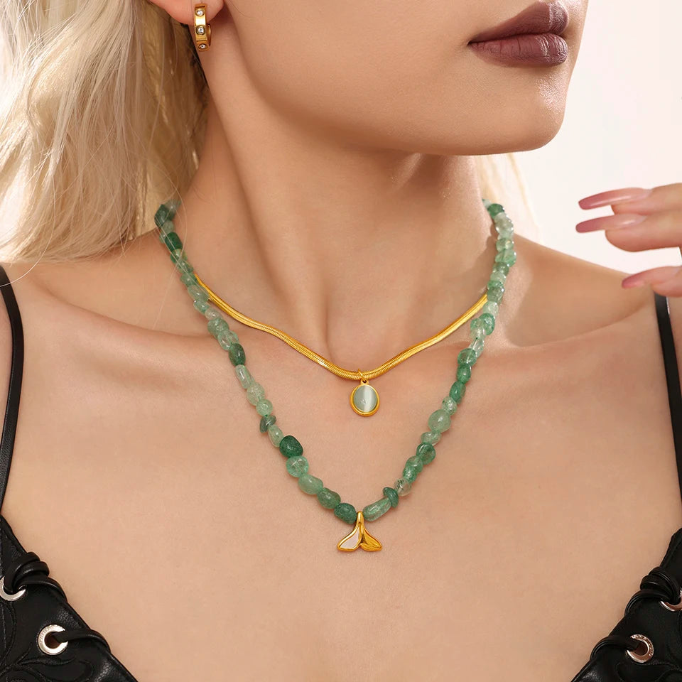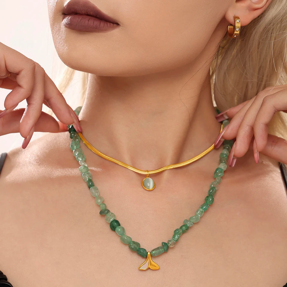 Naturinspirierte Harmonie in zwei Lagen: Eine Kombination aus goldener Schlangenkette und grünen Edelsteinperlen mit Muschelanhänger – ideal für Boho- und Sommer-Looks. Die Kette bringt Frische und Leichtigkeit in deinen Schmuckstil. Edelstahl, 18K Echtgoldbeschichtung, farbecht und hautfreundlich.