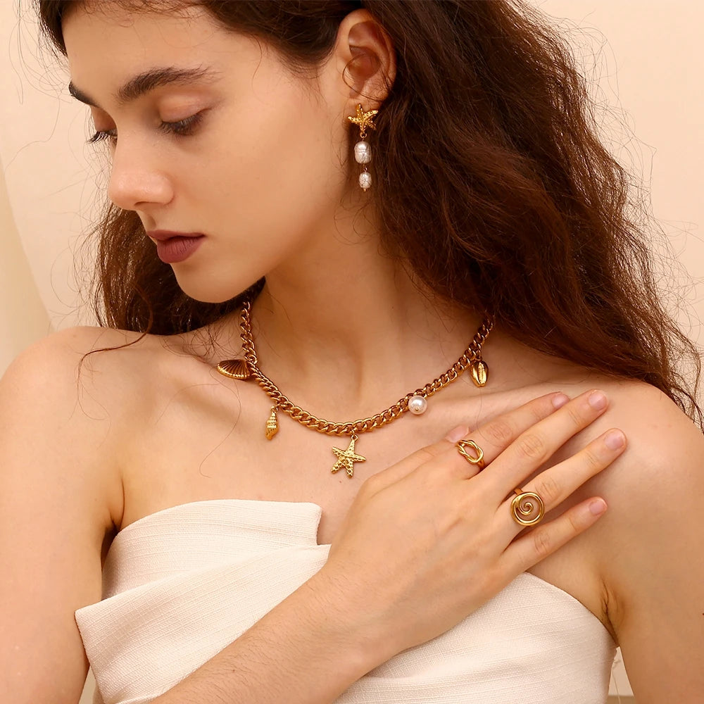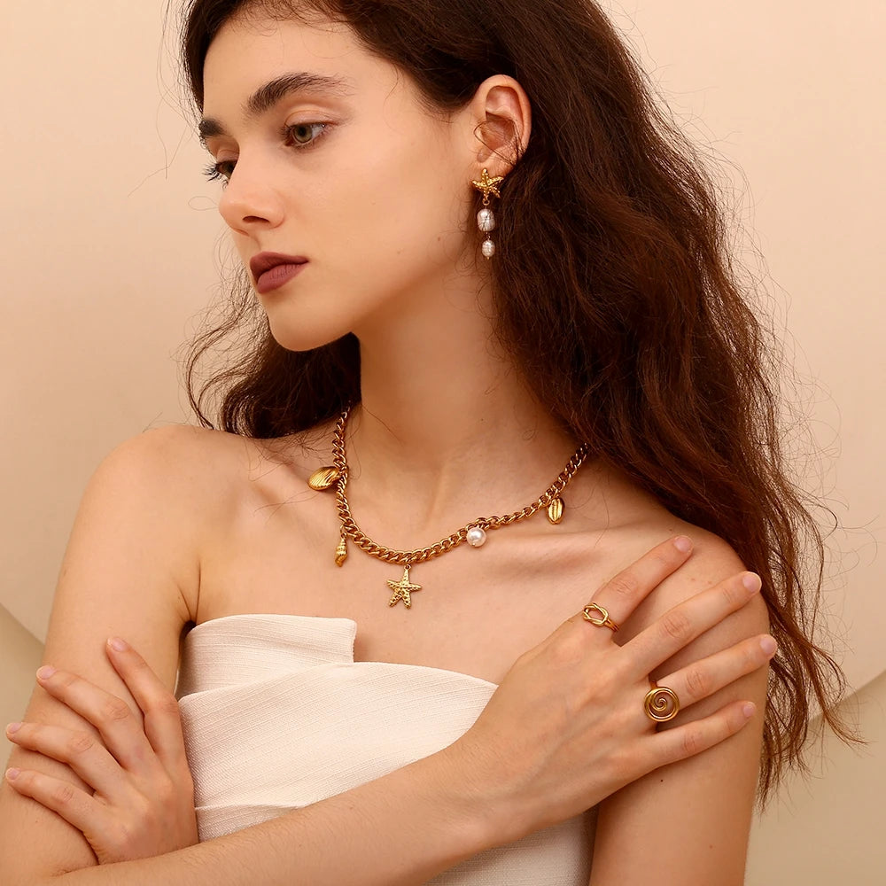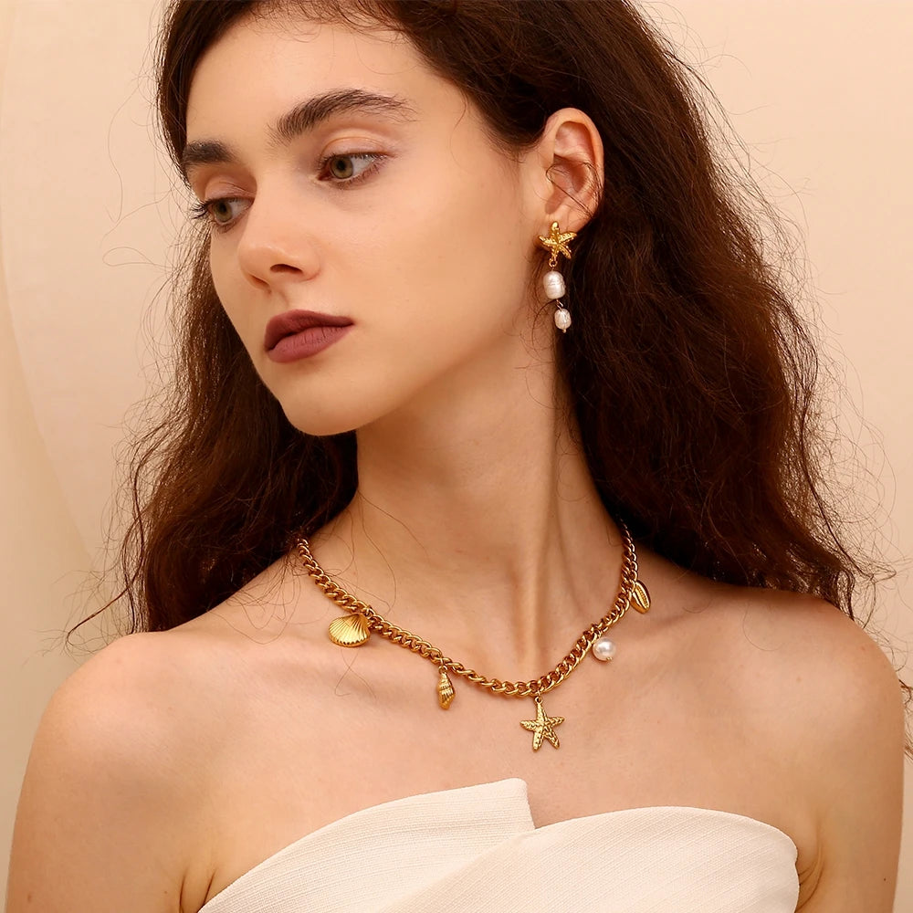 Trage den Sommer bei dir: Diese Kette mit Muscheln, Seestern und Perle erinnert an lange Strandtage und das Rauschen des Meeres. Der Mix aus Elementen verleiht deinem Look einen verspielten und zugleich stilvollen Charakter.