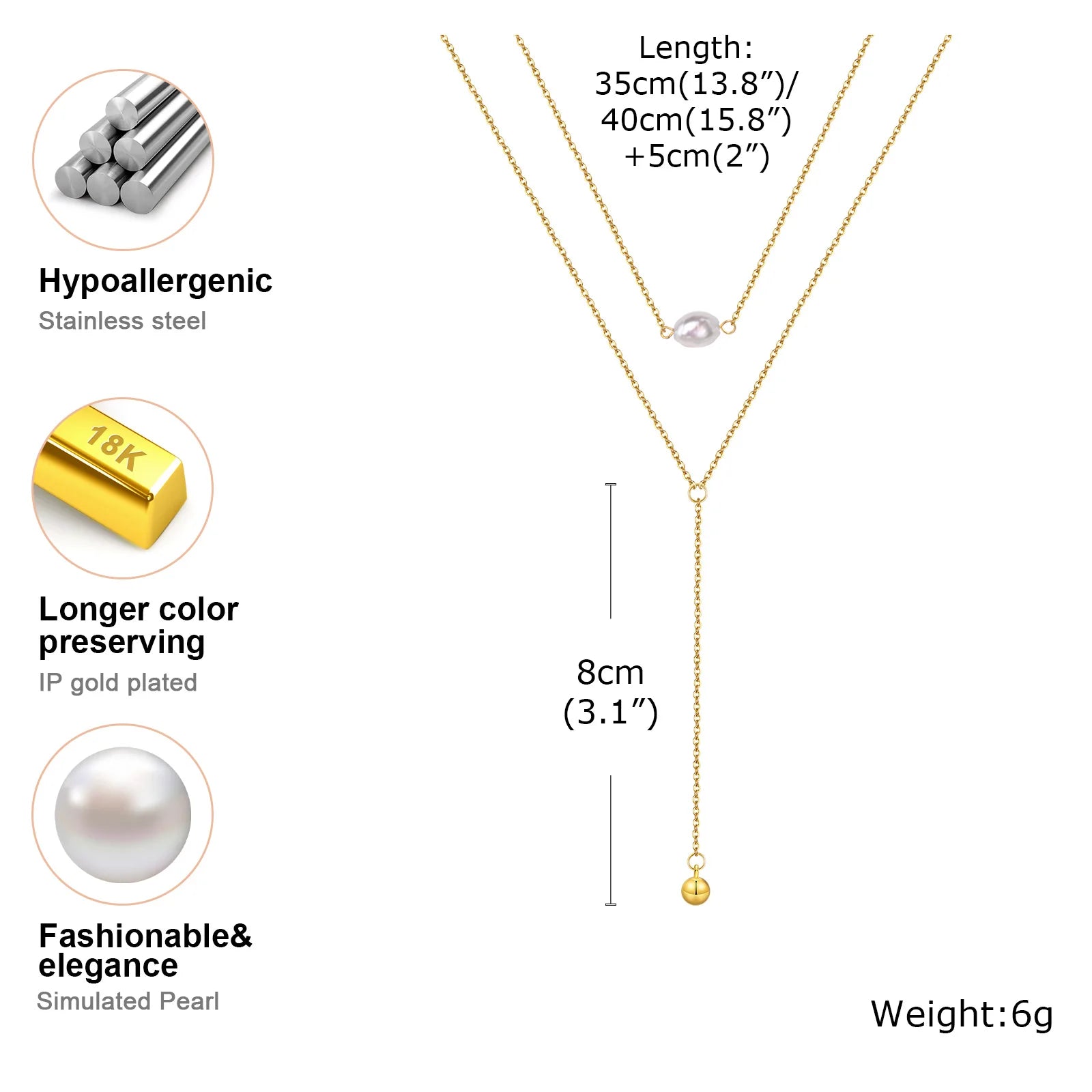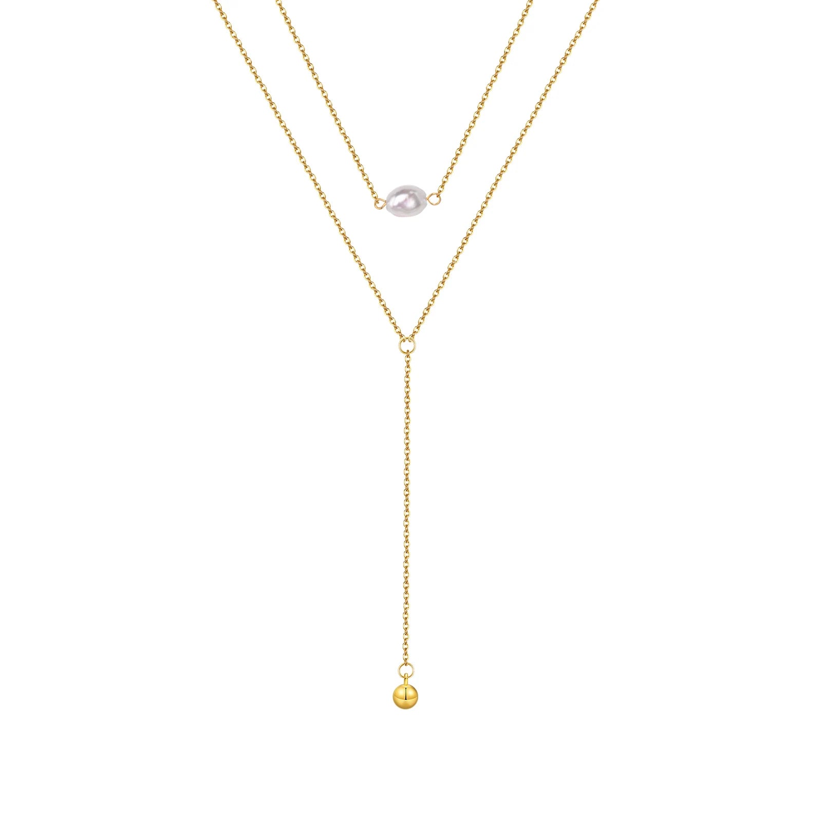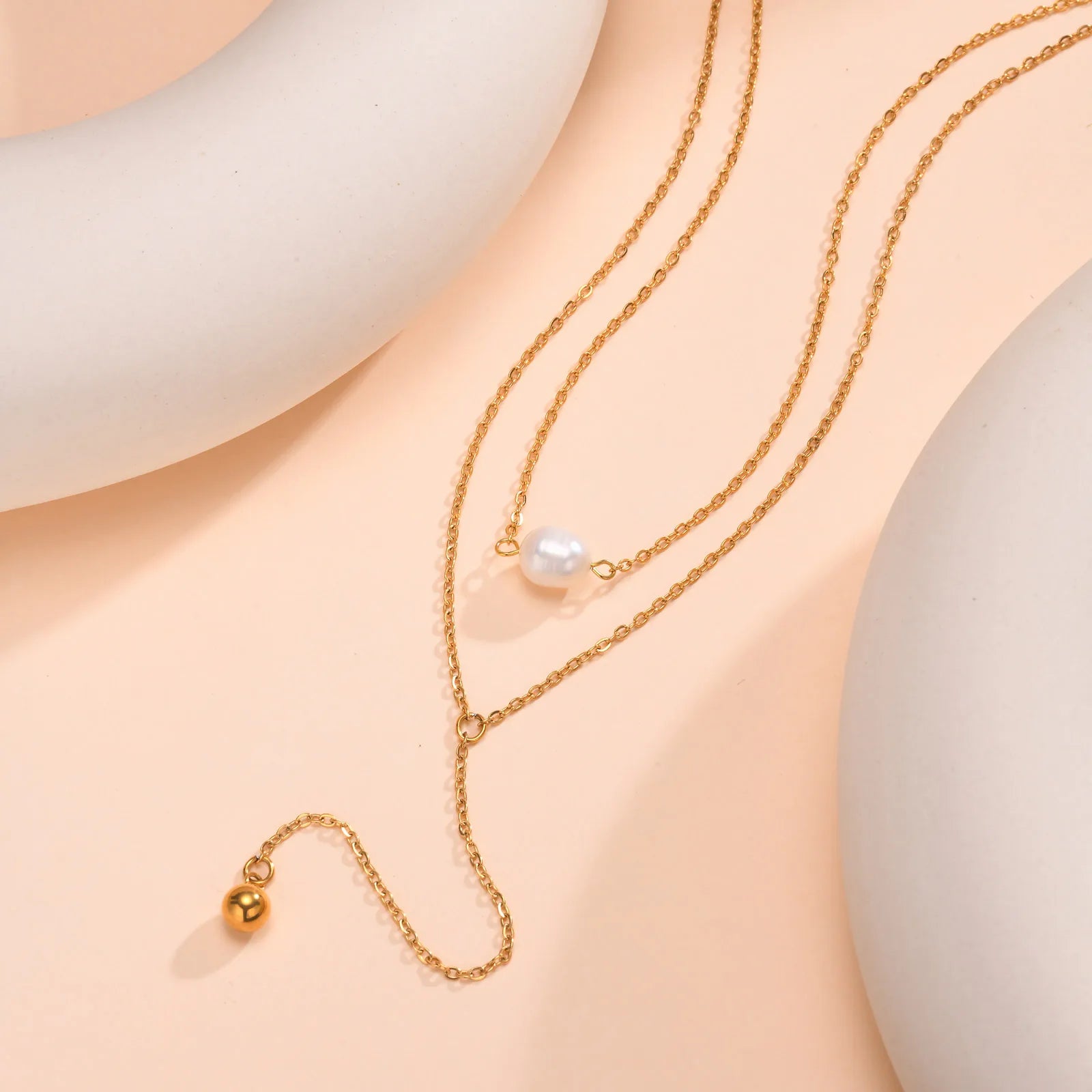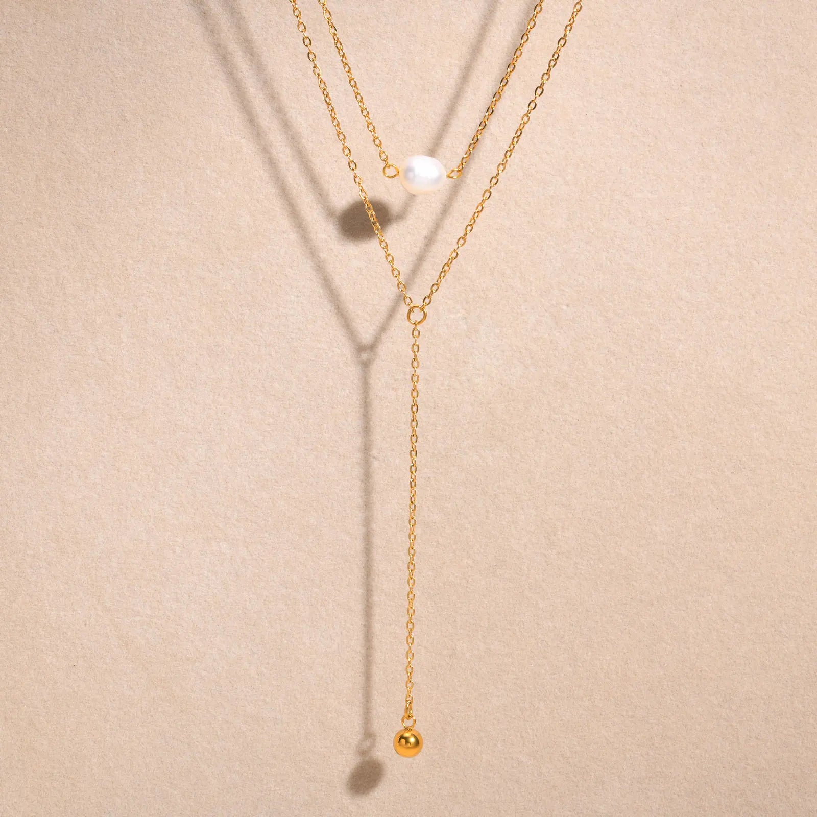 Zwei Ebenen, eine Perle, ein Statement. Diese doppellagige Kette kombiniert eine feine Gliederkette mit einer zarten Barockperle – darunter eine lange, minimalistische Verlängerung mit goldener Kugel. Die perfekte Verbindung aus klassischer Eleganz und modernem Design.