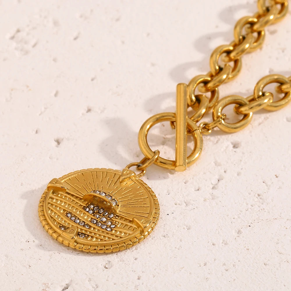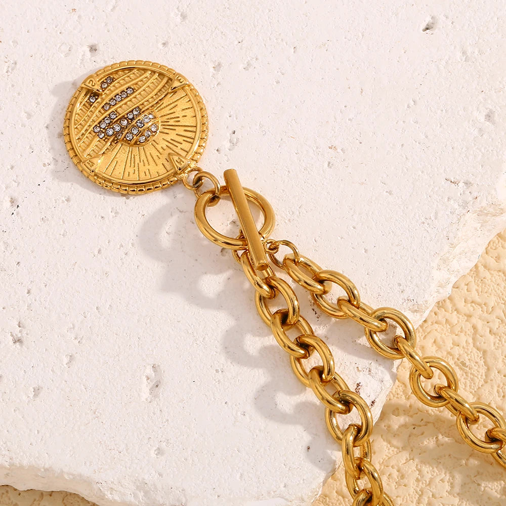 Diese goldene Kette bringt die Magie eines Sonnenaufgangs direkt auf dein Dekolleté. Der strukturierte Anhänger mit funkelnden Details erinnert an warme Sommermorgen und verleiht jedem Look Tiefe und Charakter. Ideal als Eyecatcher zu schlichten Outfits oder als Layering-Piece.