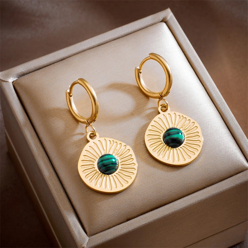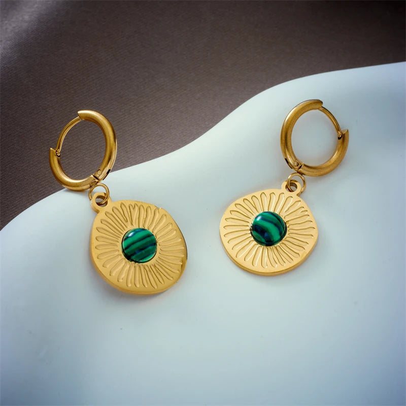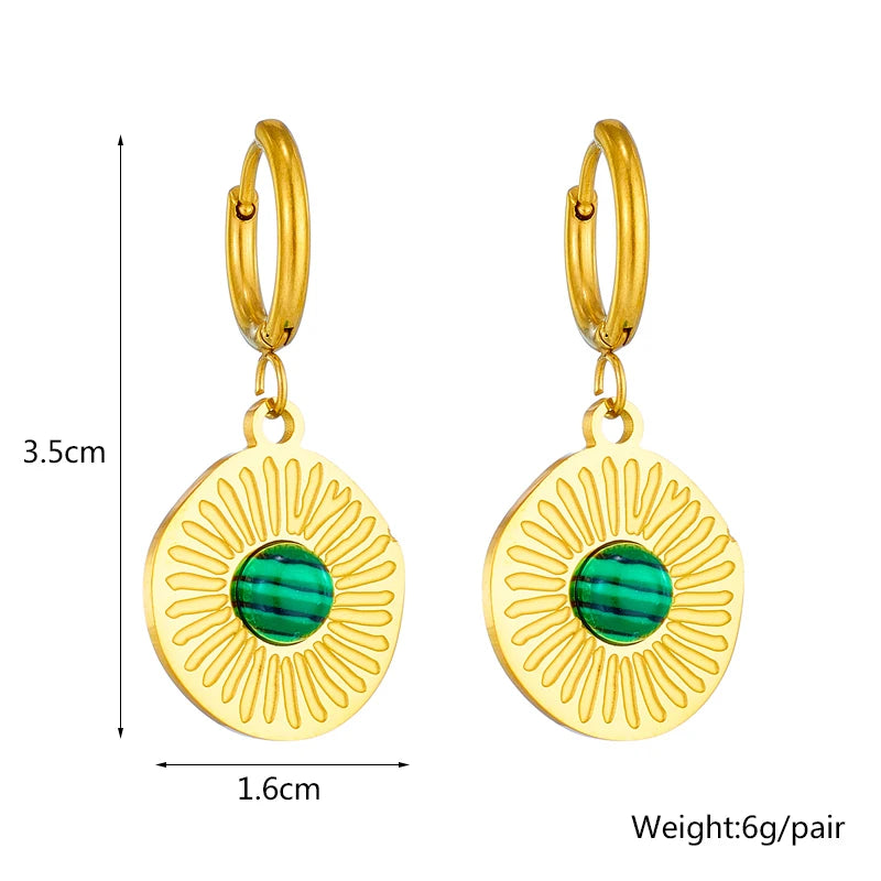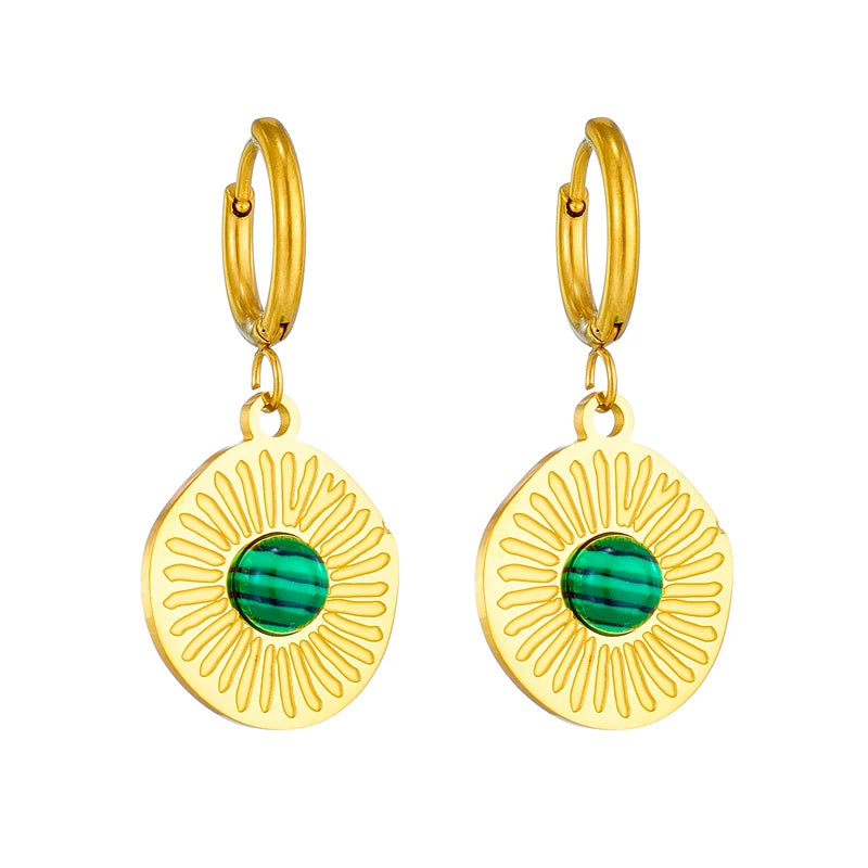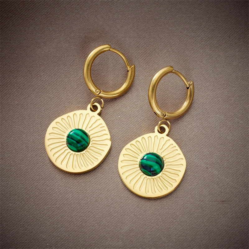 Warm & leuchtend: Diese runden Ohrringe mit goldener Sonnenstruktur und grünem Stein bringen Boho-Flair und Eleganz in Einklang – ideal für besondere Momente mit natürlicher Note.